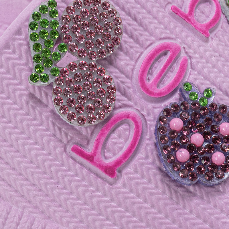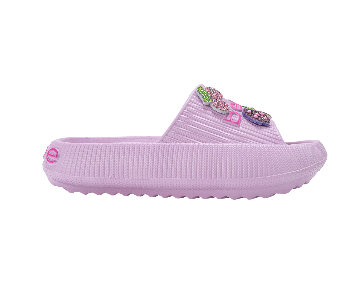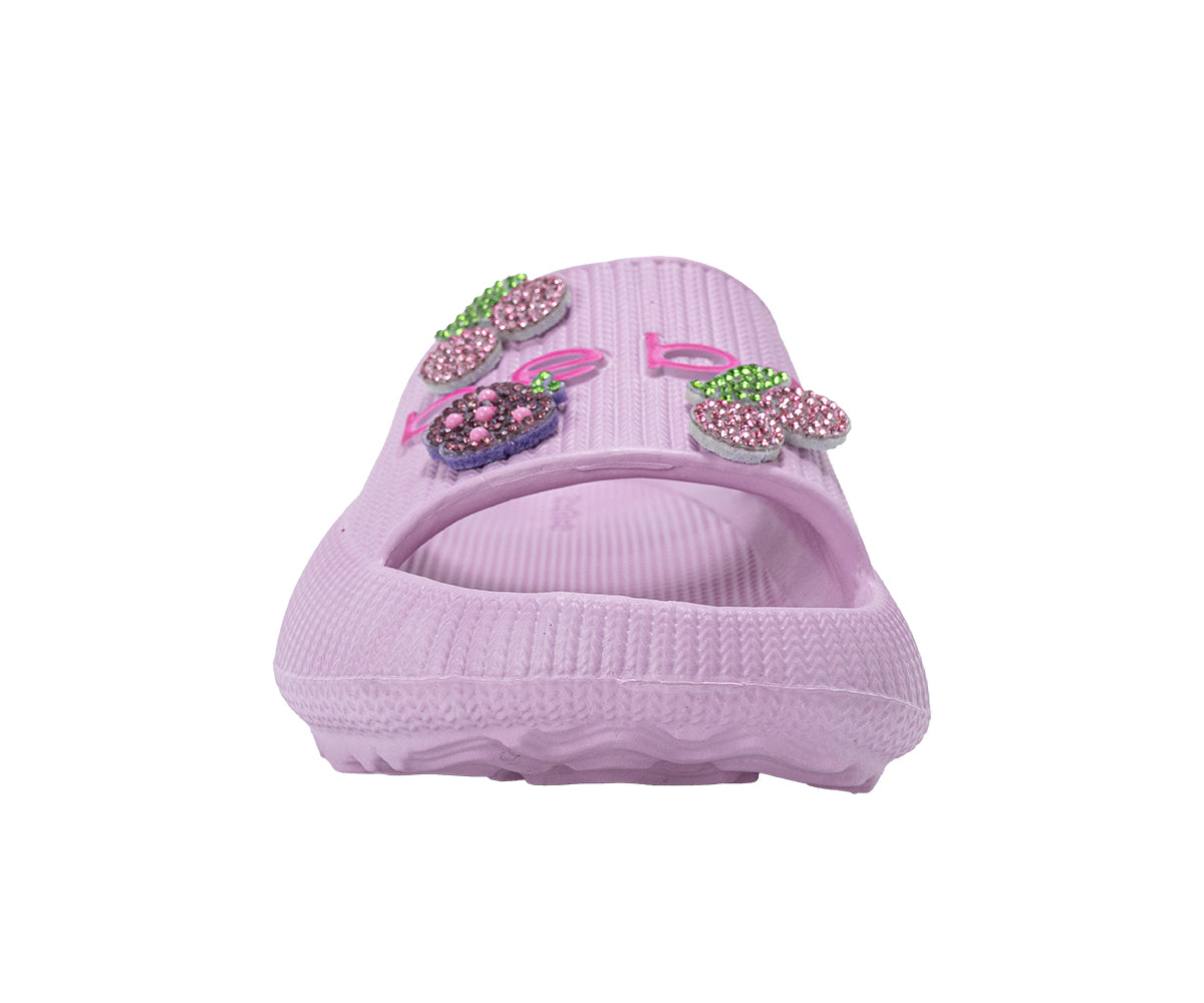 Step into sparkle with bebe Girl's EVA Slide, featuring playful rhinestone fruit patches and an easy slip-on design. Lightweight and comfy, these slides offer Gentle support for little feet, perfect for everyday wear, playdates, or sunny-day adventures.