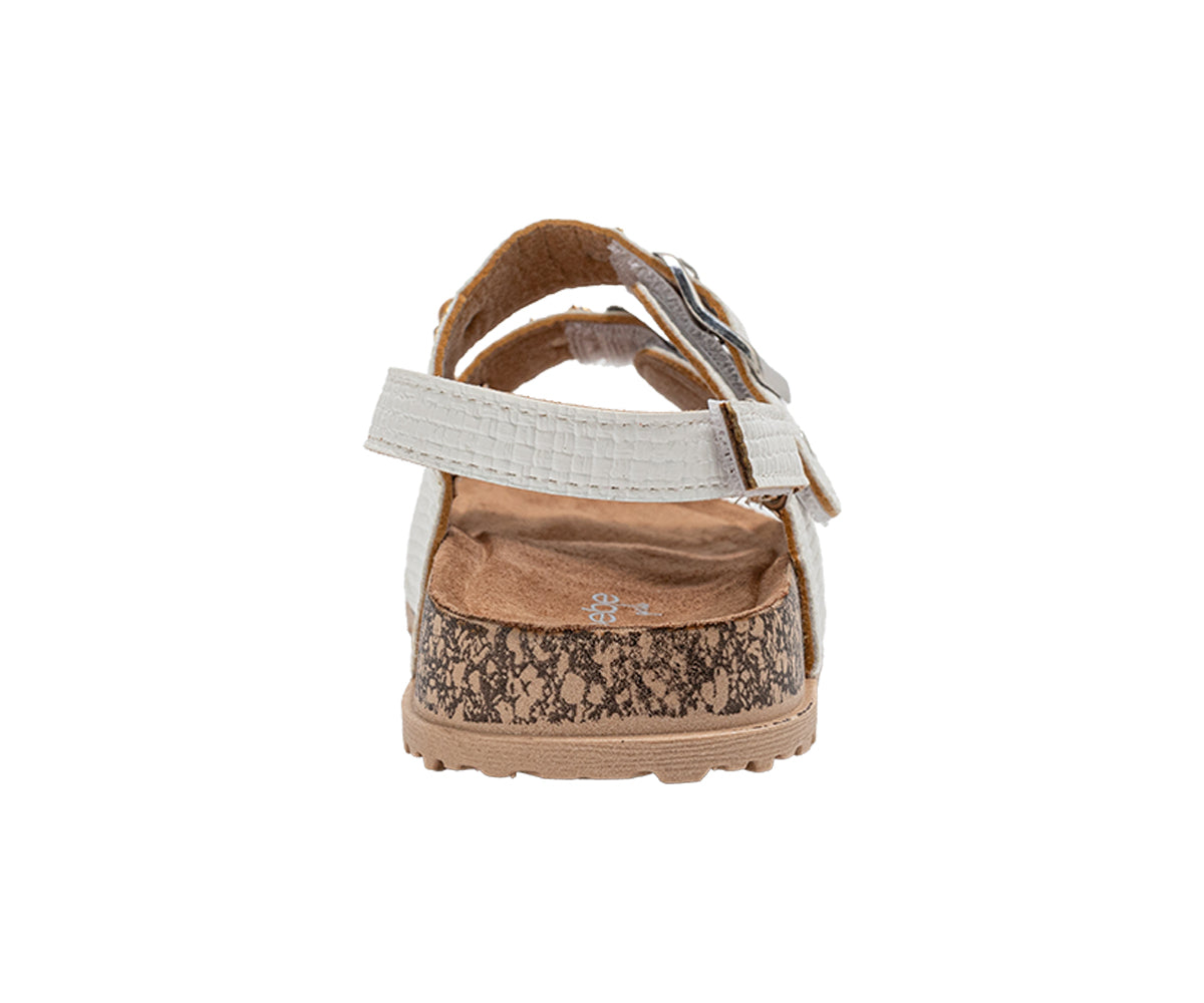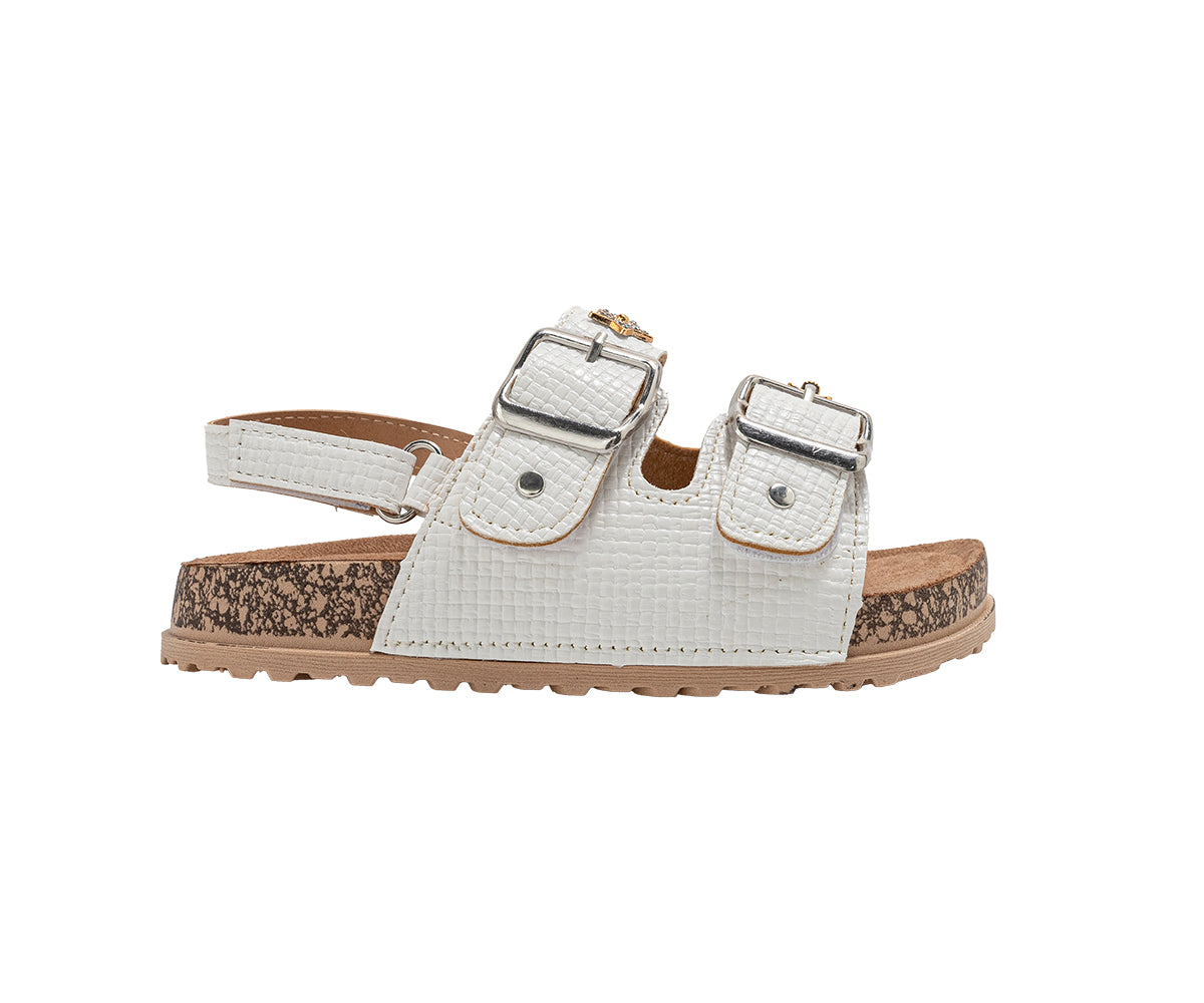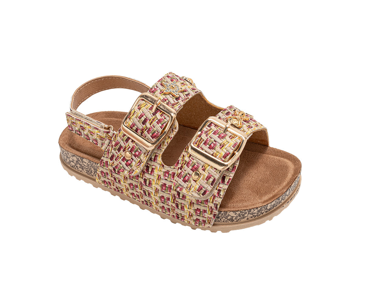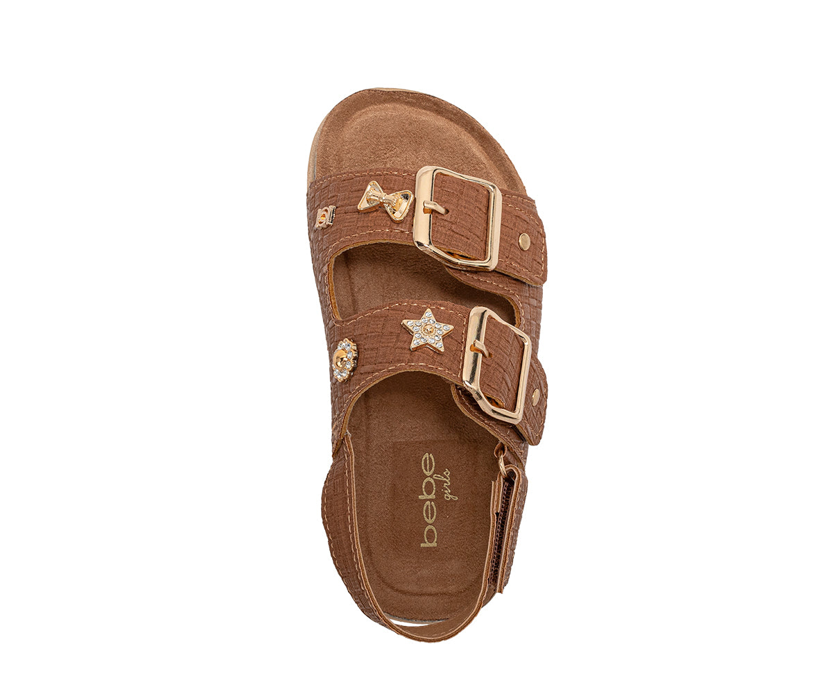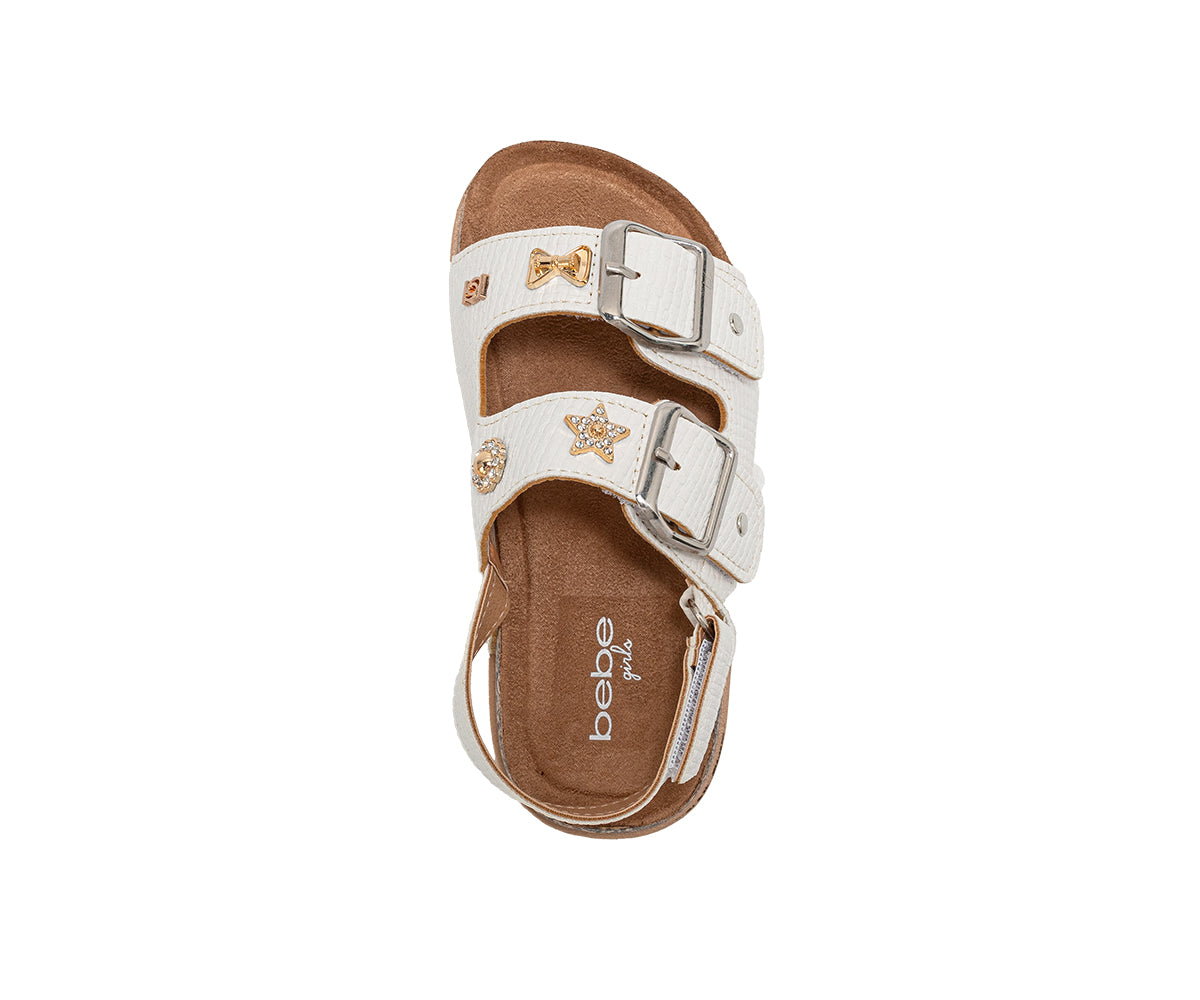 Elevate her style with these chic bebe Girl's footbed sandals. Designed for all-day comfort, they feature a supportive footbed and secure double buckle straps for a custom fit. The look is completed with a playful, decorative charm, making them perfect for stylish everyday wear.