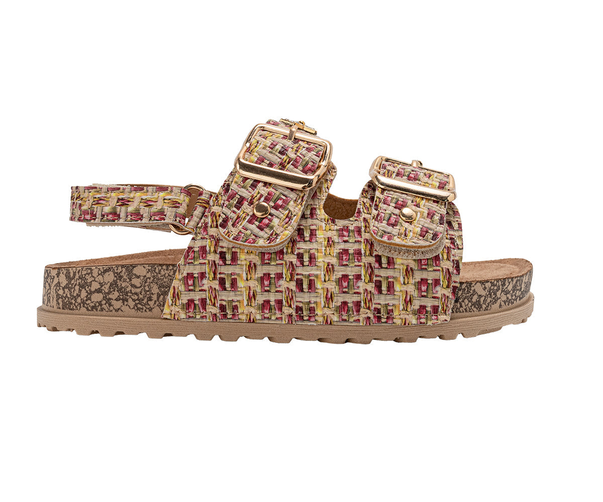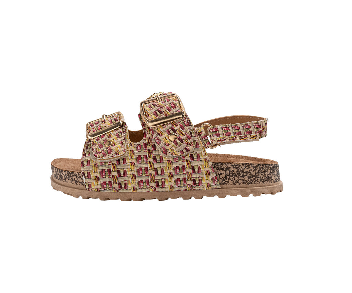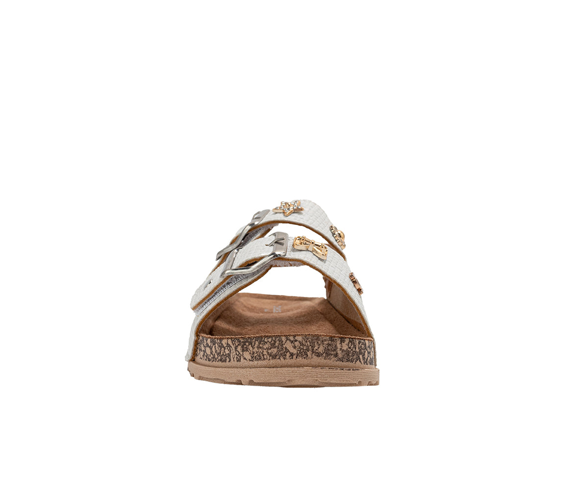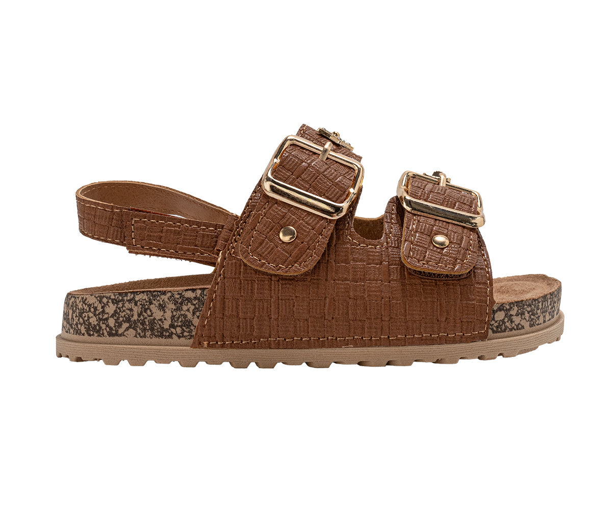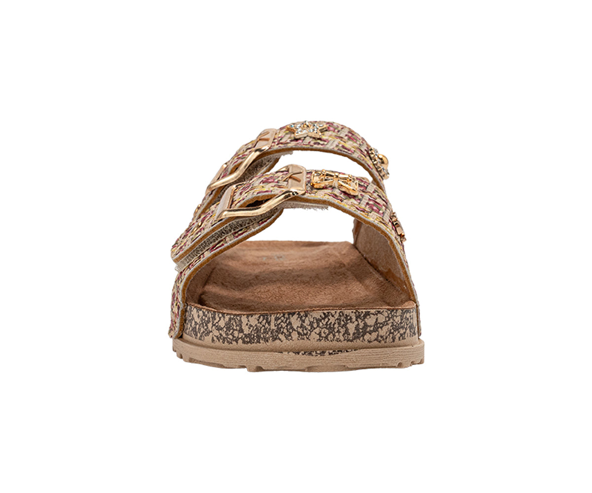 Elevate her style with these chic bebe Girl's footbed sandals. Designed for all-day comfort, they feature a supportive footbed and secure double buckle straps for a custom fit. The look is completed with a playful, decorative charm, making them perfect for stylish everyday wear.