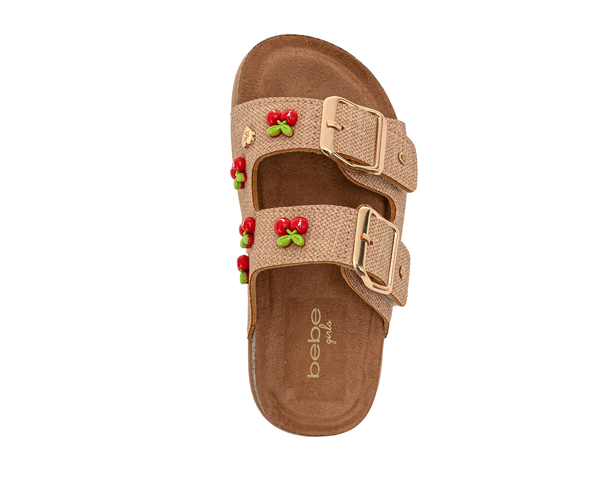 Sweeten her summer style with these bebe Girl's sandals. Designed for easy wear, the comfortable slide-on style is secured with an adjustable buckle strap. The star detail is the playful cherry charm accent, adding a fun, fruity flourish to this essential warm-weather look.