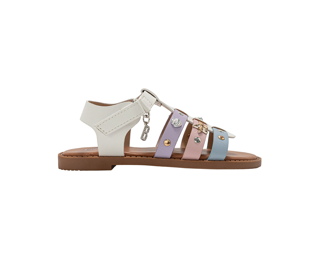 These Bebe Girls Fashion Sandals are designed to bring playful detail and comfort to any warm-weather outfit. Made as flat summer sandals for girls, they feature colorful fruit studs, stylish metal accents, and a signature hanging B charm for a fun, fashionable look. The lightweight construction helps keep feet comfortable throughout the day, while the adjustable ankle strap provides a secure and easy fit. Perfect as girls summer shoes, these sandals are ideal for everyday wear, vacations, beach days, parties, and special occasions. A stylish and comfortable addition to any girl’s footwear collection.